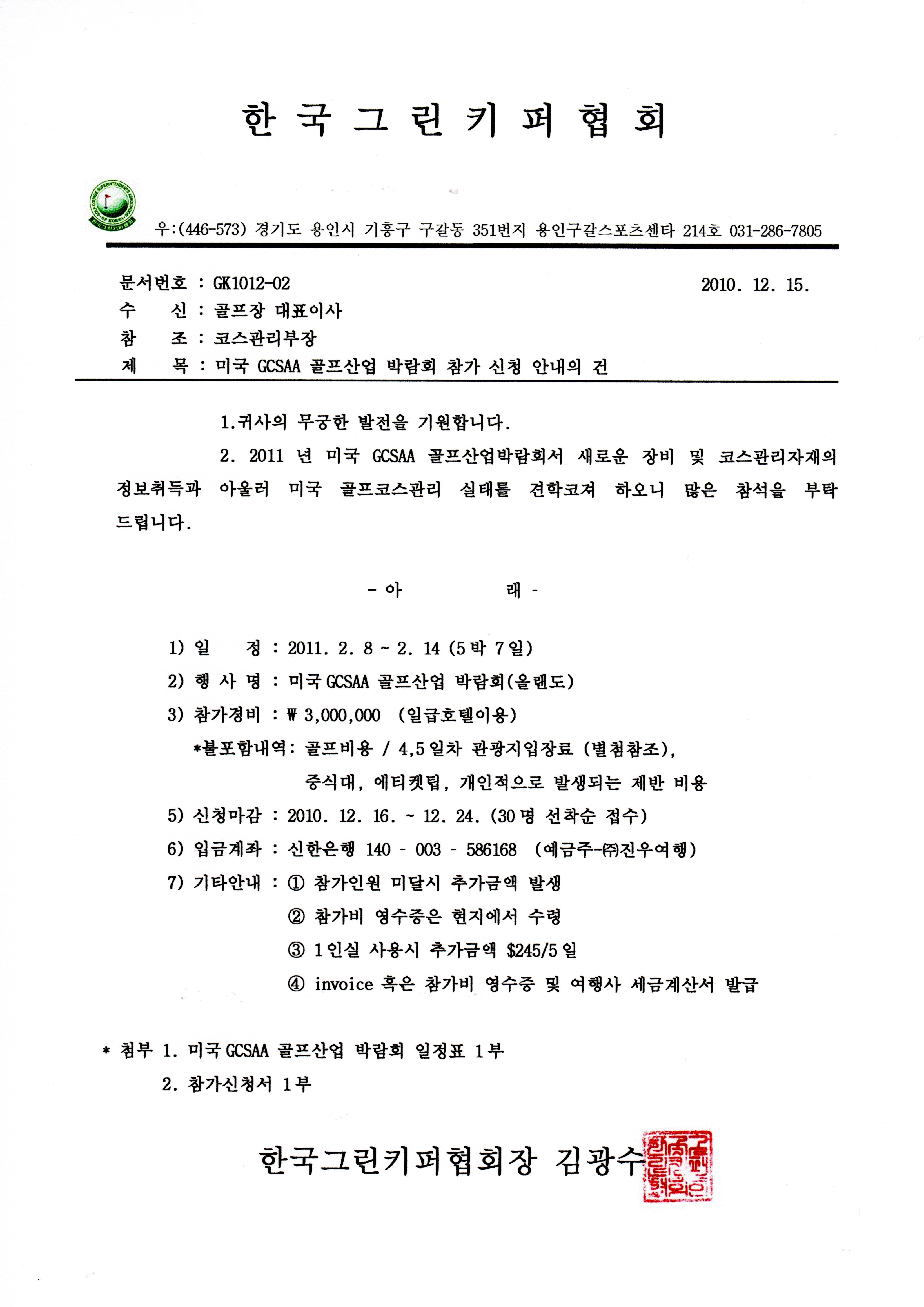 | 제목 | 미국 GCSAA 골프산업 박람회 참가 신청 안내의 건 | ||